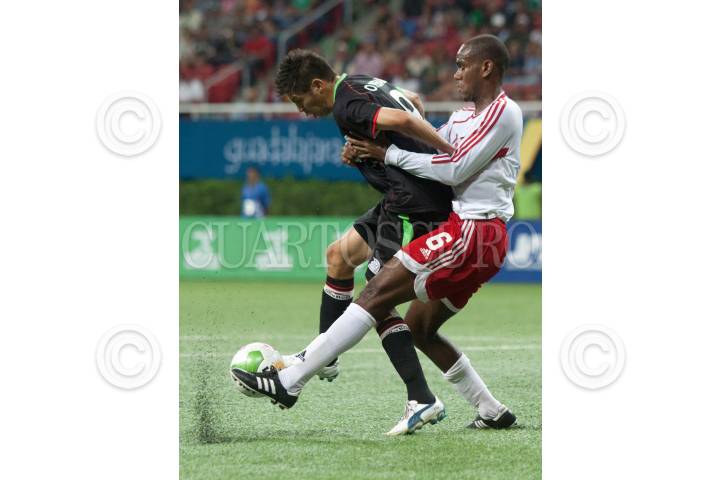 GUADALAJARA, JALISCO, 21OCTUBRE2011.- La selección mexicana de fútbol se enfrenta a su similar de Trinidad y Tobago en los Juegos Panamericanos Guadalajara 2011 donde empató a un gol. Kevin Molino (Trinidad y Tobago) pelea un balón con Jorge Enrique (México) durante el partido. FOTO: IVÁN STEPHENS/CUARTOSCURO.COM