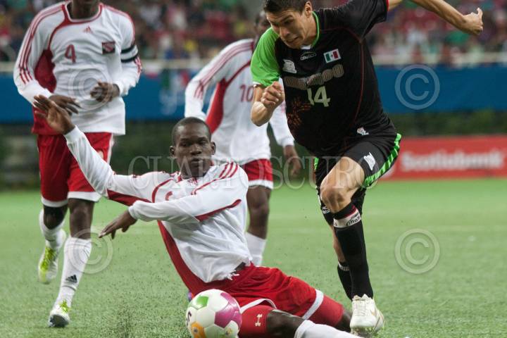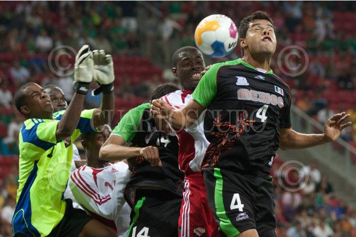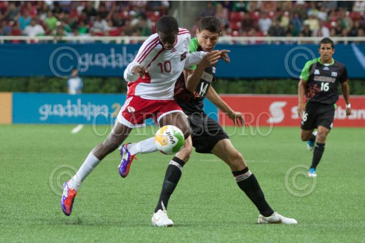 GUADALAJARA, JALISCO, 21OCTUBRE2011.- La selección mexicana de fútbol se enfrenta a su similar de Trinidad y Tobago en los Juegos Panamericanos Guadalajara 2011 donde empató a un gol. Jorge Enrique pelea un balón con el jugador de Trinidad y Tobago. FOTO: IVÁN STEPHENS/CUARTOSCURO.COM