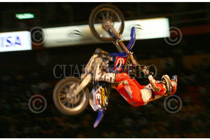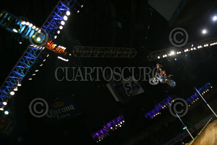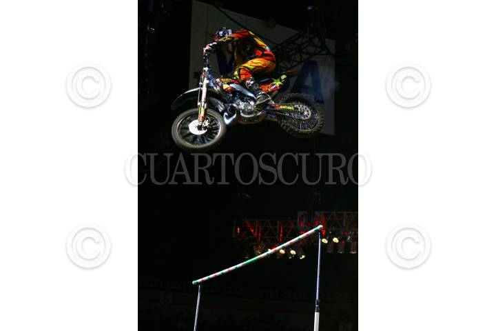 MÉXICO,D,F.,08SEPTIEMBRE2007.-Todd Potter primer lugar durante la competencia de los X Games México en el palacio de los deportes final de Motocross en la categoria trick realiza una de sus acrobacias. FOTO:SASHENKA GUTIERREZ/CUARTOSCURO.COM