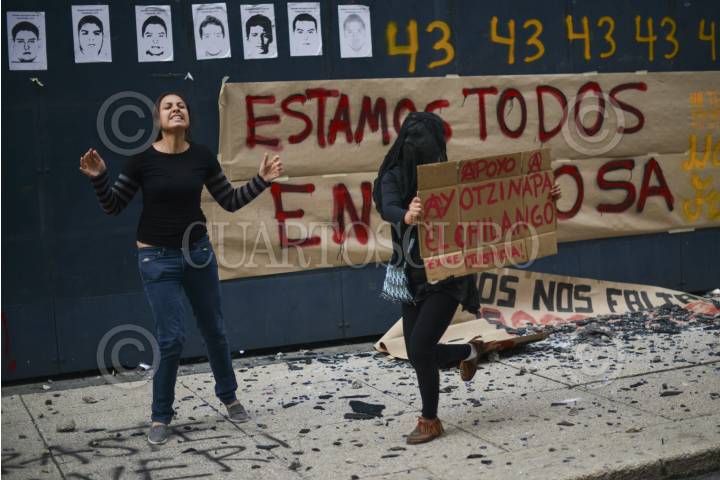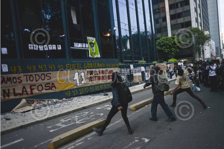 MÉXICO, D.F., 15OCTUBRE2014.- Estudiantes de la Universidad Nacional Autónoma de México, Universidad Autónoma de México y Universidad Autónoma de la Ciudad de México, entre otras, además de organizaciones sociales y políticas, se manifestaron frente al edificio de la Procuraduría General de la República (PGR) en demanda de la aparición con vida de los 43 estudiantes normalistas desaparecidos el 26 de septiembre en Iguala, Guerrero. Con mantas, consignas, pintas, representaciones escénicas y rabia, miles, en su mayoría jóvenes, exigieron el esclarecimiento del los 43 estudiantes de Ayotzinapa. Al terminó del mitin programado, algunos jóvenes arrojaron piedras al edificio público, del cual nunca salió ninguna autoridad federal. FOTO: ADOLFO VLADIMIR /CUARTOSCURO.COM
