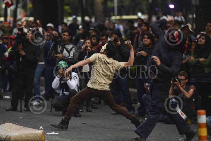 MÉXICO D.F., 01DICIEMBRE2014.- De la plancha del Zócalo al Ángel de la Independencia miles de personas, de diferentes organizaciones sociales, estudiantiles y políticas, acompañaron a familiares de los 43 estudiantes normalistas desaparecidos de Ayotzinapa, en la marcha por la aparición con vida de los jóvenes. Al termino del mitin la policía capitalina, en búsqueda de un grupo de jóvenes que atacaron bancos, encapsularon a manifestantes a la altura del Senado, golpearon a personas e intentaron detener a manifestantes. FOTO: ADOLFO VLADIMIR /CUARTOSCURO.COM