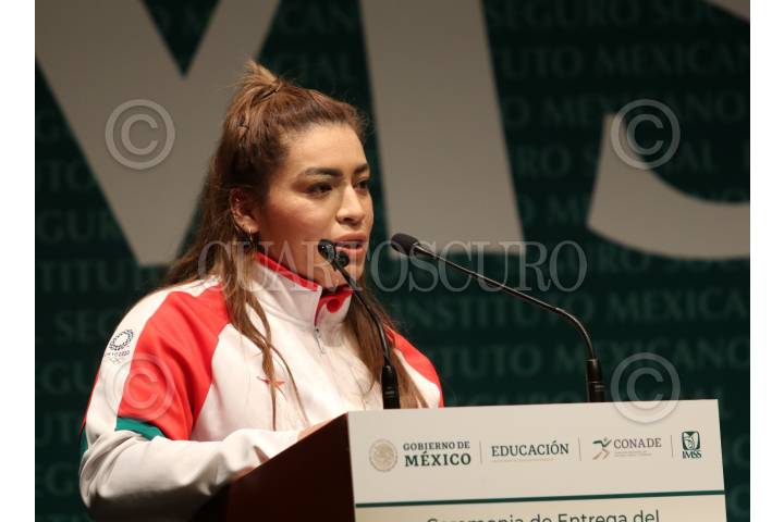 Areli Fuentes, multimedallista durante la entrega del Premio Estatal del Deporte 2021 a Paola Estrada Santana de vóleibol y Jaime Gallegos, Paraciclista.