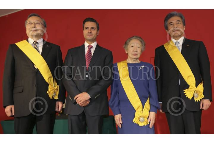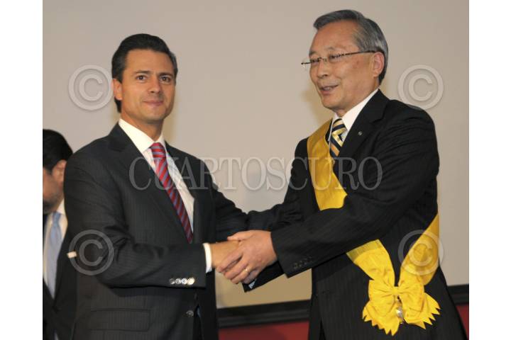 TOKYO, JAPÓN, 10ABRIL2013.- Los ciudadanos japoneses Hirofumi Nakasone, Takashi Yamanouchi y Sadako Ogata, recibieron de Enrique Peña Nieto, presidente de México, la Orden Mexicana del Águila Azteca, el máximo galardón que otorga México a quienes han prestado servicios prominentes a nuestra nación o a la humanidad. FOTO: PRESIDENCIA /CUARTOSCURO.COM