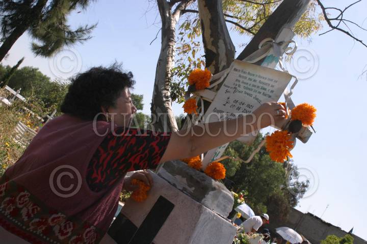 MEXICO, D.F., 02NOVIEMBRE20005.- Una mujer reza al pie de la tumba de su pariente fallecido, en el Panteón Civil San Nicolas Tolentino, durante las celebración del Día de Muertos. FOTO: Moisés Pablo/CUARTOSCURO.COM