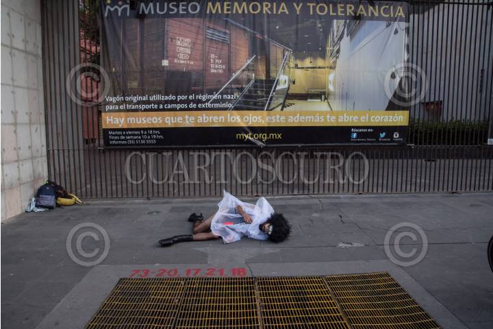 CIUDAD DE MÉXICO, 26ABRIL2017.- Un hombre con vestimenta de mujer, autonombrado "Drag", realizó un performance simulando estar muerto afuera del Museo Memoria y Tolerancia, para protestar en contra del sitio, ya que según la persona se le negó el acceso por su apariencia al intentar ingresar para visitar una exposición de feminicidios. Coloquialmente la palabra "Drag" se refiere al uso de ropa del sexo opuesto FOTO: TERCERO DÍAZ /CUARTOSCURO.COM