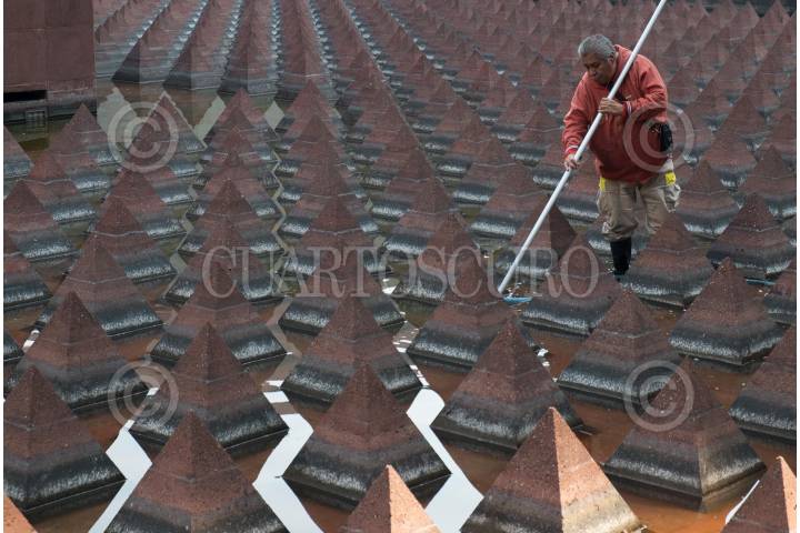 CIUDAD DE MÉXICO, 23FEBRERO2018.- Hombre limpia la instalación de pirámides frente al Museo de la Memoria y Tolerancia. FOTO: ANDREA MURCIA /CUARTOSCURO.COM