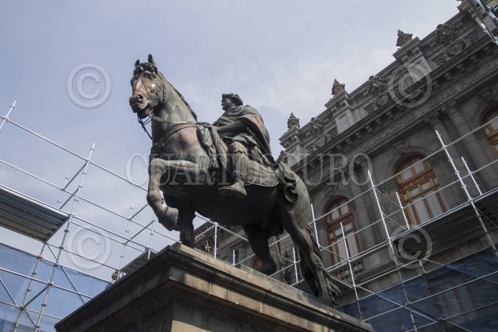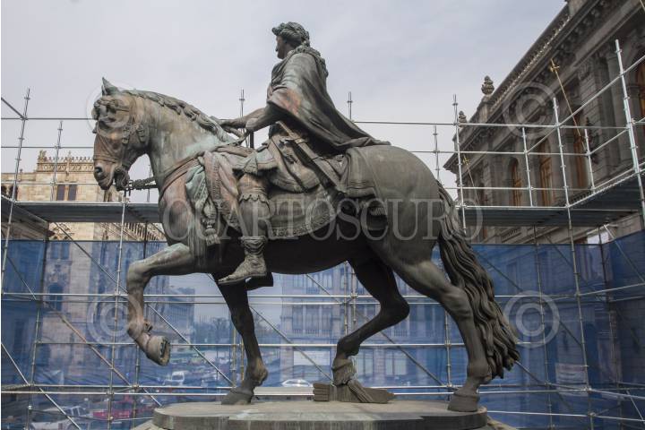 MÉXICO, D.F., 07OCTUBRE2013.- La escultura de Carlos IV mejor conocida como “El Caballito” permanece resguardada por una malla y vallas mientras concluye el período de restauración y reparo del daño que presuntamente se le hizo. FOTO: ENRIQUE ORDÓÑEZ /CUARTOSCURO.COM