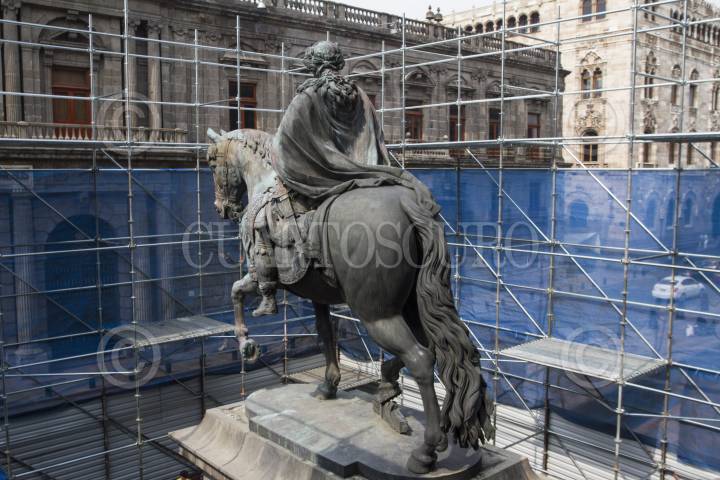 MÉXICO, D.F., 08OCTUBRE2013.- La escultura ecuestre de Carlos IV, llamada comúnmente "El Caballito", del escultor y arquitecto Manuel Tolsá, permanece resguardada mientras concluye la restauración y reparo después de los daños irreversibles que sufrió, de acuerdo a la información proporcionada por el INAH. FOTO: IVAN MÉNDEZ /CUARTOSCURO.COM