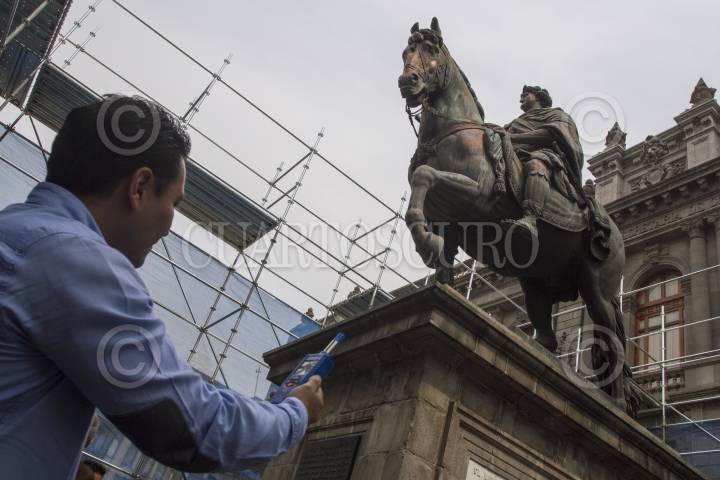 CIUDAD DE MÉXICO, 28JUNIO2017.- El proceso de restauración y conservación que permitió restituir de forma integral la escultura ecuestre de Carlos IV, mejor conocida como "El Caballito", quedó concluida después de más un año de trabajos, esto tras los daños que sufrió de una mala intervención de limpieza en el año 2013. El Instituto Nacional de Antropología e Historia dio a conocer que los expertos atendieron al monumento en su totalidad restaurando tanto la escultura metálica como el basamento y su pedestal. En la imagen durante las labores de restauración. FOTO: INAH /HÉCTOR MONTAÑO/CUARTOSCURO.COM
