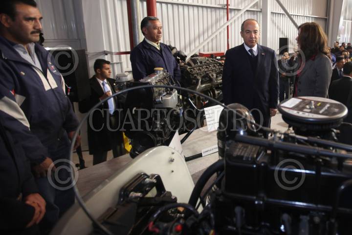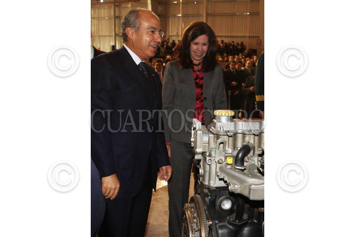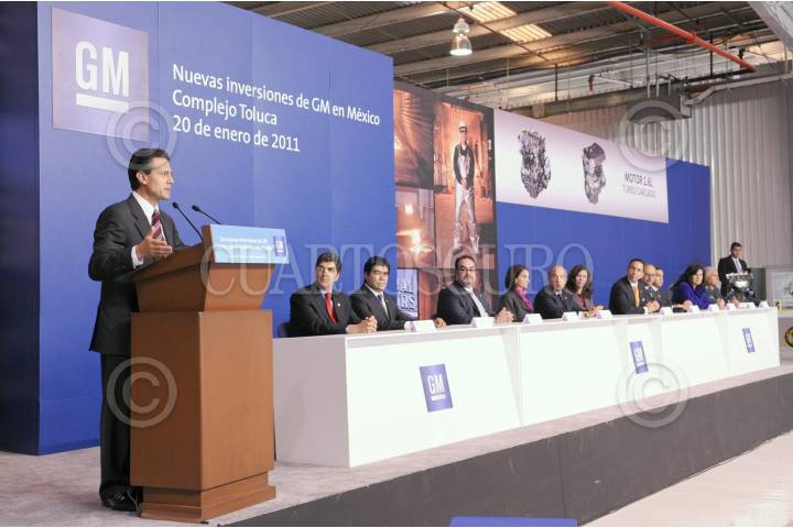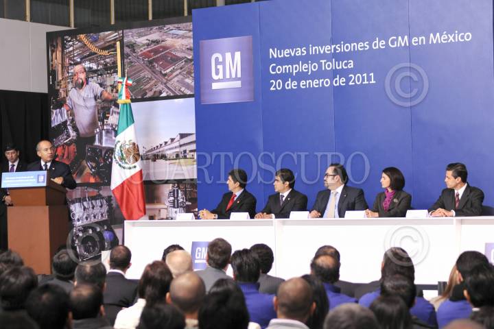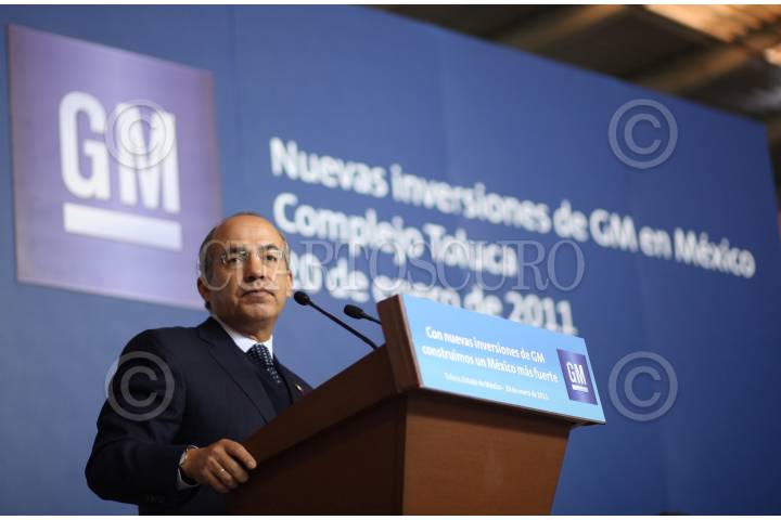 TOLUCA, ESTADO DE MÉXICO, 20ENERO2011.- El presidente Felipe Calderón durante el anuncio de inversión para la planta de motores y componentes de aluminio de General Motors en el complejo de Toluca. FOTO: ALFREDO GUERRERO/CUARTOSCURO.COM