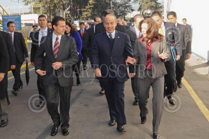 TOLUCA, ESTADO DE MÉXICO, 20ENERO2011.- Enrique Peña Nieto, gobernador del Estado de México y el presidente Felipe Calderón a su llegada al evento del anuncio de inversión para la planta de motores y componentes de aluminio de General Motors en el complejo de Toluca. FOTO: CUARTOSCURO.COM