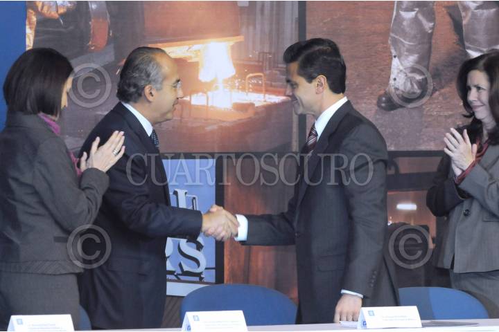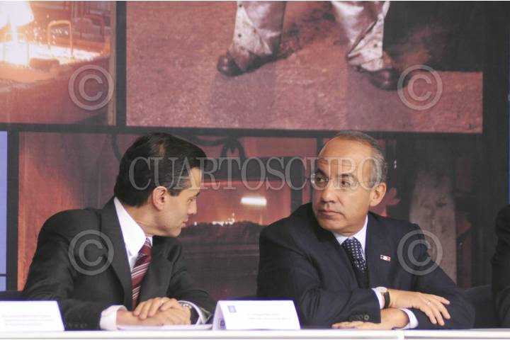 TOLUCA, ESTADO DE MÉXICO, 20ENERO2011.- Enrique Peña Nieto, gobernador del Estado de México conversa con el presidente Felipe Calderón durante el anuncio de inversión para la planta de motores y componentes de aluminio de General Motors en el complejo de Toluca. FOTO: CUARTOSCURO.COM