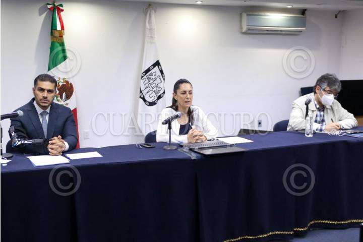 Claudia Sheinbaum, Omar García Harfuch, y Tomás Pliego Calvo, durante la videoconferencia con el tema de seguridad en la capital.