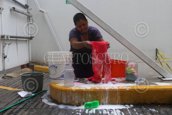 Una integrante de la comunidad de indígenas otomíes originarias de Santiago Mexquititlán lavó sus prendas durante el día 17 de la toma de las instalaciones del Instituto Nacional de los Pueblos Indígenas (INPI)