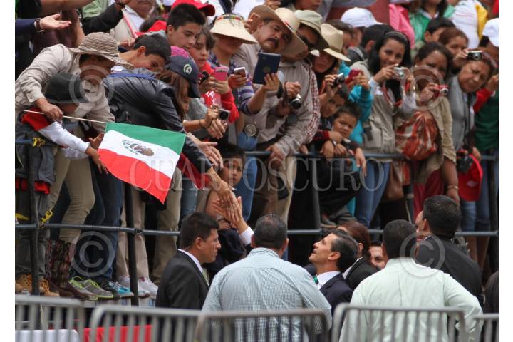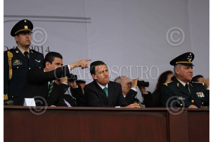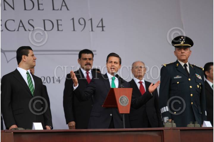 ZACATECAS, ZACATECAS, 23JUNIO2014.- Enrique Peña Nieto, presidente de México, Salvador Cienfuegos, Secretario de la Defensa y Miguel Alonso Reyes, gobernador del Estado, observan la representación por elementos del Ejército Mexicano de la Toma de Zacatecas, como parte de los festejos por el centenario en la cual la División del Norte al mando de Francisco Villa, Felipe Angeles y Pánfilo Natera, derrotó al ejército federal en la batalla que fue a la postre la derrota de Victoriano Huerta y el triunfo de la Revolución. FOTO: ADOLFO VLADIMIR /CUARTOSCURO.COM