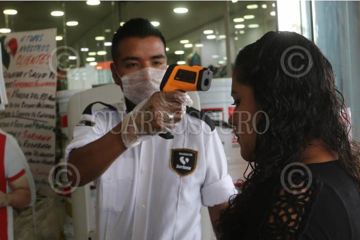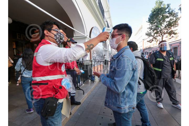 En un Centro Comercial se toman medidas sanitarias como la toma de temperatura, aplicación de gel antibacterial y el ingreso de una persona por familia para evitar el contagio del Covid-19