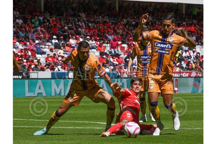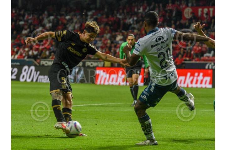 TOLUCA, ESTADO DE MÉXICO, 31OCTUBRE2023.- Martín Barragán delantero de la Franja de Puebla y Tomás Belmonte medio de los Diablos de Toluca en el partido correspondiente a la jornada 15 del Torneo Apertura 2023 de la Liga MX con un marcador final 0-1.- FOTO: CRISANTA ESPINOSA AGUILAR /CUARTOSCURO.COM
