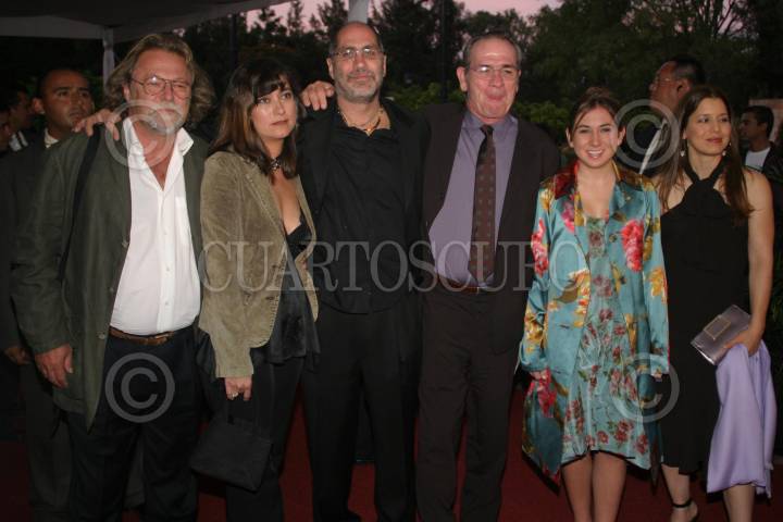 MORELIA, MICHOACAN 08OCTUBRE2005.- El productor George Fitzgerald, la esposa del guionista Guillermo Arriaga, el guionista, Tommy Lee Jones, su esposa e hija llegan a la alfombra roja de la premiere "Los tres entierros de Melquiades Estrada" con la que dio inicio el festival de cine internacional de Morelia. FOTO: Miguel Dimayuga/CUARTOSCURO.COM