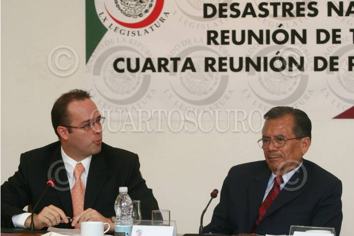 MÉXICO, D.F., 25JULIO2008.- El senador Heladio Ramírez acompañado por Rúben Hofliger Topete director de Operaciones del Fonden, durante la reunión con la subcomisión de desastres naturales del senado donde se analizaron los fondos de apoyo a la población afectada por tormentas tropicales e incendios forestales. FOTO: SÁSHENKA GUTIÉRREZ/CUARTOSCURO.COM