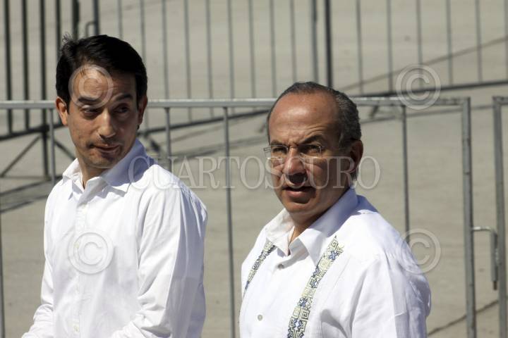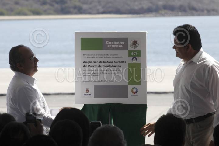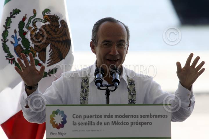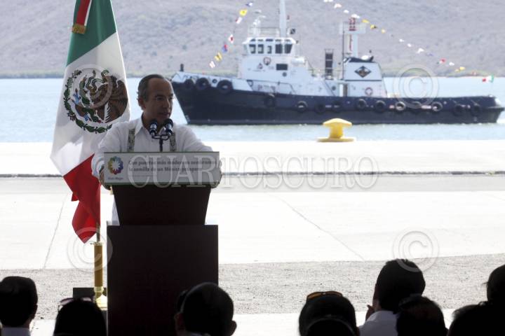 TOPOLOBAMPO, SINALOA, 20FEBRERO2012.- Felipe Calderón Hinojosa presidente de la república durante el acto inaugural de las obras de ampliación del puerto de Topolobampo una de las mas importantes en la ultima década. El proyecto contempla la ampliación de al menos 25 hectáreas más del patio de maniobras y el dragado del canal principal. La inversión fue de más de 750 millones de pesos en dos etapas. FOTO: RASHIDE FRIAS/CUARTOSCURO.COM