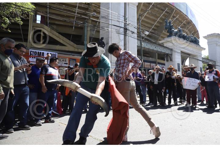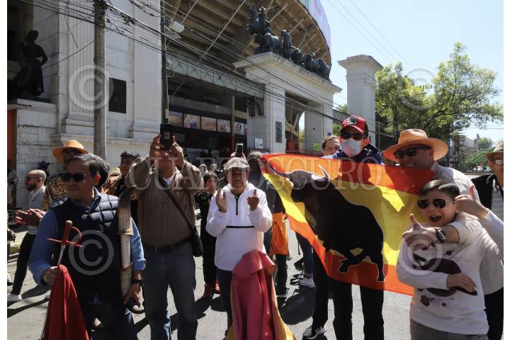 Aficionados y trabajadores de la Plaza de Toros México se reunieron a las afueras de este inmueble para recabar firmas en defensa de la llamada fiesta brava y de sus fuente de trabajo.