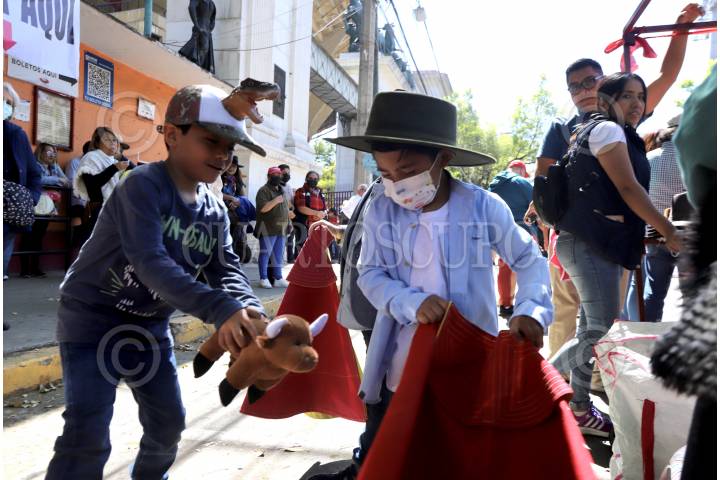 Niños juegan a los toros, mientras aficionados y trabajadores de la Plaza de Toros México se reúnen a las afueras de este inmueble para recabar firmas en defensa de la llamada fiesta brava y de sus fuente de trabajo.