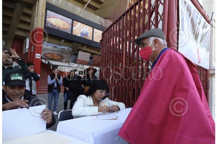El torero Isaac Fonseca acompañó a aficionados y trabajadores de la Plaza de Toros México que se reunieron a las afueras de este inmueble para recabar firmas en defensa de la llamada fiesta brava y de sus fuente de trabajo.