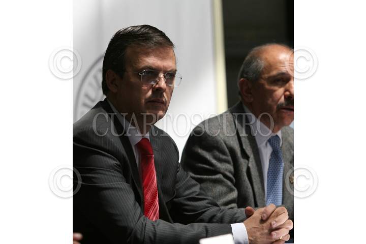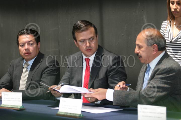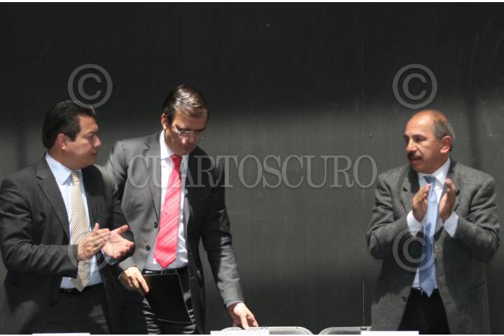 MÉXICO D.F. 19MARZO2008.-Marcelo Ebrad Casaubon jefe del gobierno capitalino, realizo la firma del Convenio para la Creación del Corredor Periférico que correra de Canal de Garay a el Toreo.En la imagen es acompañado por los secretarios de Finanzas, Mario Delgado Carrillo; de Transportes y Vialidad, Armando Quintero Martínez. FOTO: GUILLERMO PEREA/CUARTOSCURO.COM