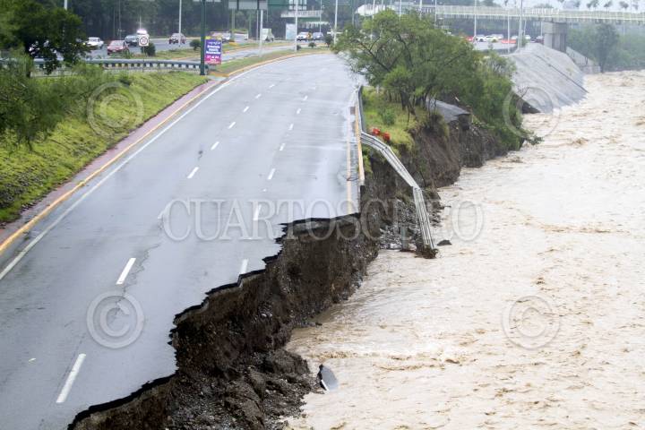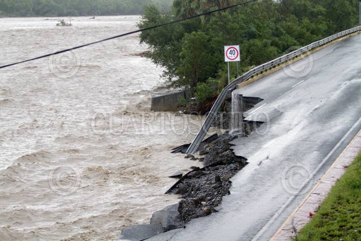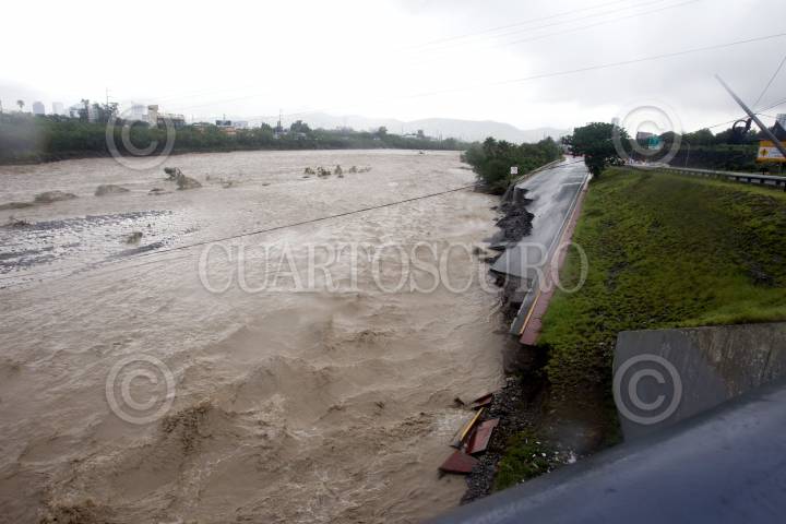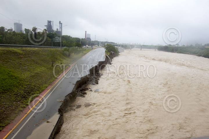 MONTERREY, NUEVO LEÓN, 20JUNIO2024- La tormenta tropical Alberto, ha dejado una creciente en ríos, arroyos y presas del estado de Nuevo León, en el área metropolitana, el río Santa Catarina ha sobrepasado los límites hacia los carriles de la avenida Constitución, así mismo provocado desgajamiento en la carpeta asfáltica. Diversas avenidas han sido cerradas a la vialidad por encharcamientos. FOTO: GABRIELA PÉREZ MONTIEL / CUARTOSCURO.COM