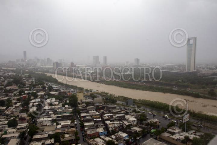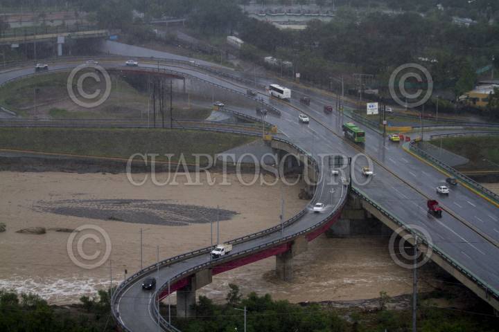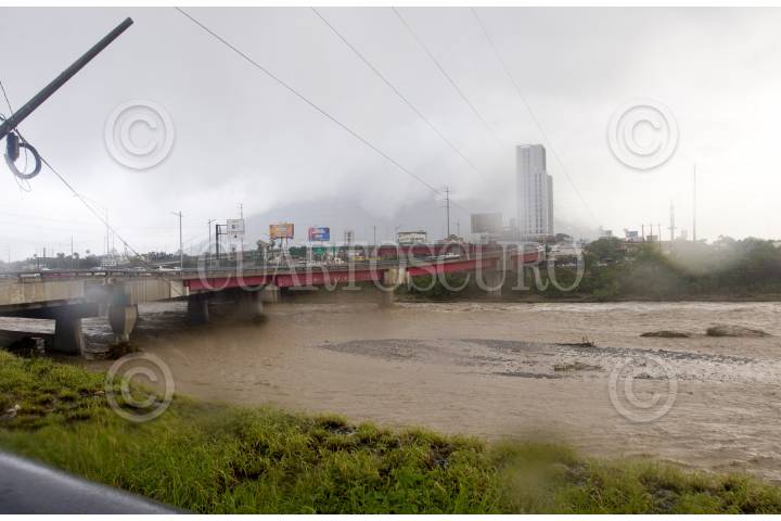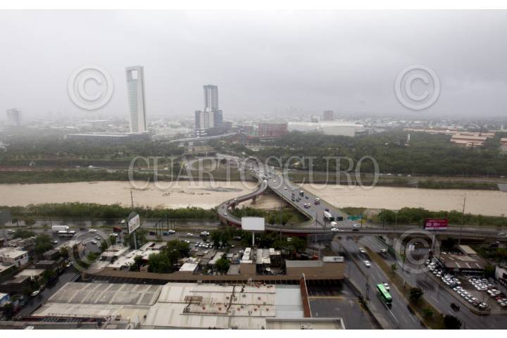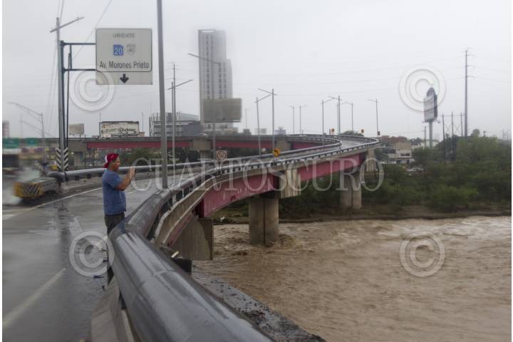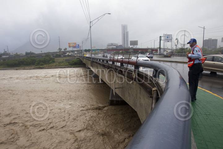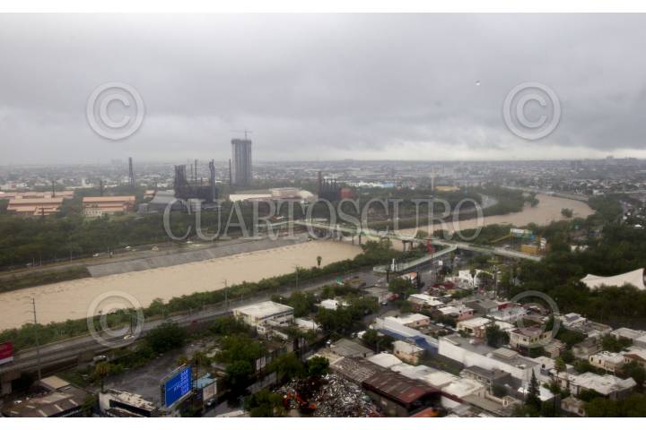 MONTERREY, NUEVO LEÓN, 21JUNIO2024.- Vista panorámica de la creciente del Río Santa Catarina, a la altura del puente Revolución, mismo que desemboca en el Río Bravo, una vez arribando a Tamaulipas, ante el paso de la tormenta tropical "Alberto". FOTO: GABRIELA PÉREZ MONTIEL / CUARTOSCURO.COM