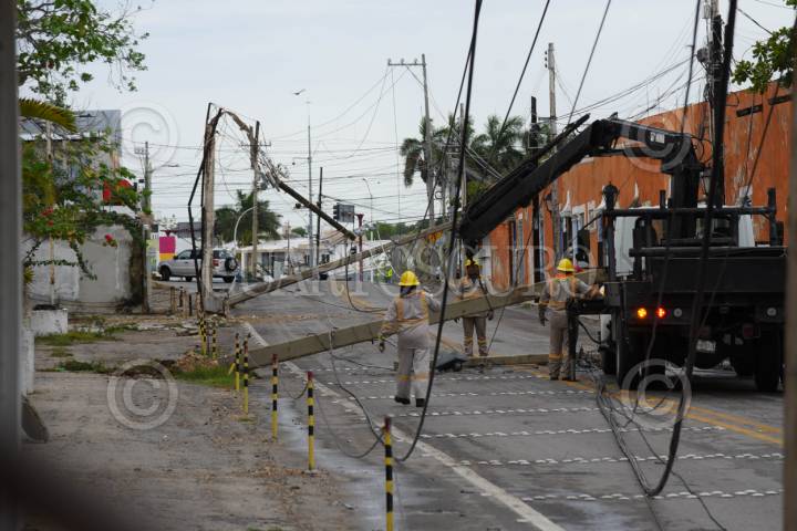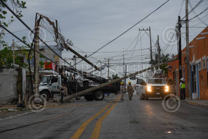 CAMPECHE, CAMPECHE, 19JUNIO2025.- Una turbonada registrada en la capital de Campeche provocó la caída de tres postes de energía eléctrica en la calle Lazareto del fraccionamiento Montecristo, afectando el suministro en varias viviendas de la zona. FOTO: MICHAEL BALAM/CUARTOSCURO.COM