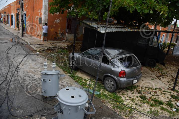 CAMPECHE, CAMPECHE, 19JUNIO2025.- Un transformador cayó sobre un vehículo durante una turbonada registrada en la calle Lazareto del fraccionamiento Montecristo, en la capital de Campeche. El incidente ocurrió tras la caída de postes de energía eléctrica. FOTO: MICHAEL BALAM/CUARTOSCURO.COM