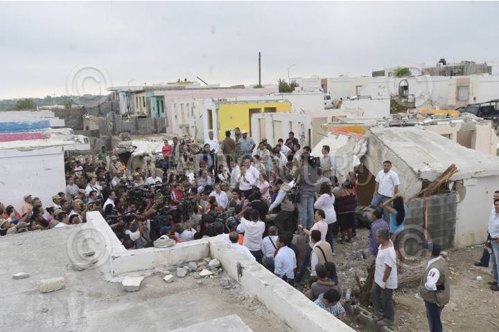 CIUDAD ACUÑA, COAHUILA, 25MAYO2015.- El Presidente Enrique Peña Nieto realizó un recorrido por la zona que resultó afectada por el tornado que se registró la madrugada de este lunes en Ciudad Acuña, poco antes de encabezar una reunión de evaluación de los daños, y ofreció el respaldo del Gobierno de la República para iniciar la reconstrucción tanto de las viviendas siniestradas, como de la infraestructura afectada. “No están solos”, les expresó a los habitantes de Ciudad Acuña. FOTO: PRESIDENCIA /CUARTOSCURO.COM