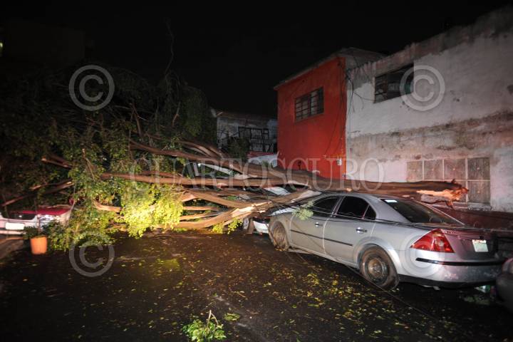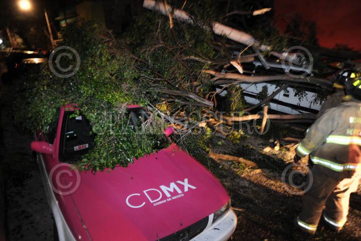 CIUDAD DE MÉXICO., 24MAYO2017.- Varios vehículos aplastados, casas con daños en sus fachadas, lonas y postes caídos, fue el saldo de la tromba que azoto, algunas colonias de la delegación Miguel Hidalgo. Siendo la colonia Huichapan, una de las más afectadas. Al lugar, arribaron bomberos y personal de la CFE, quienes laboraron por varias horas para retirar los escombros de ramas y postes, así como reestablecer la energía eléctrica de la zona. FOTO: LUIS CARBAYO /CUARTOSCURO.COM