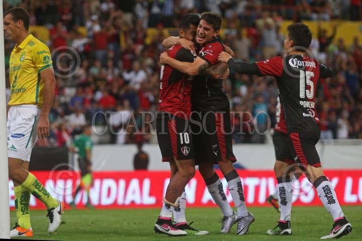 GUADALAJARA, JALISCO. 23ABRIL2016.- Jefferson Duque jugador de Atlas festeja con sus compañeros su anotación misma que les da la mínima ventaja en partido correspondiente a la Jornada 15 del Torneo Clausura 2016 de la Liga MX, en donde se enfrentan los Zorros del Atlas frente a los Panzas Verdes de León en encuentro que se lleva a cabo en el Estadio Jalisco. FOTO : FERNANDO CARRANZA GARCIA / CUARTOSCURO.COM