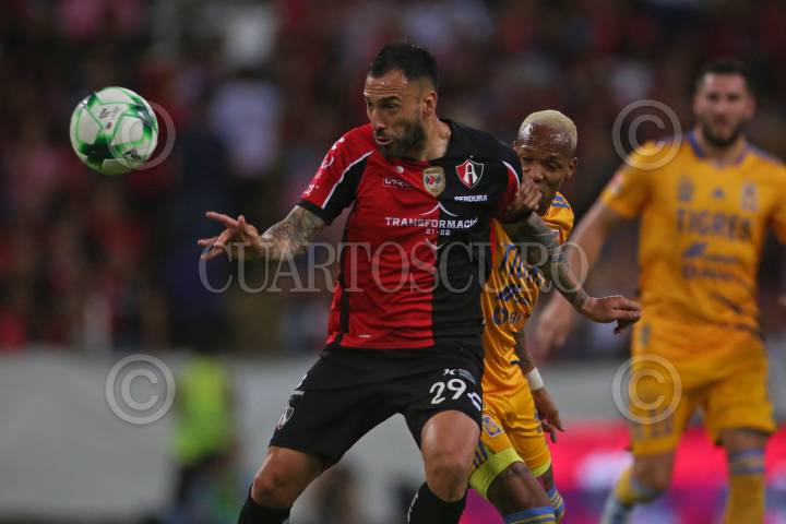 Jesús Dueñas jugador de Tigres disputa un balón con el contrario de Atlas Aníbal Chala, esto en partido correspondiente a la semifinal del Torneo Grita México Clausura 2022 de la Liga MX, entre Atlas y Tigres.
