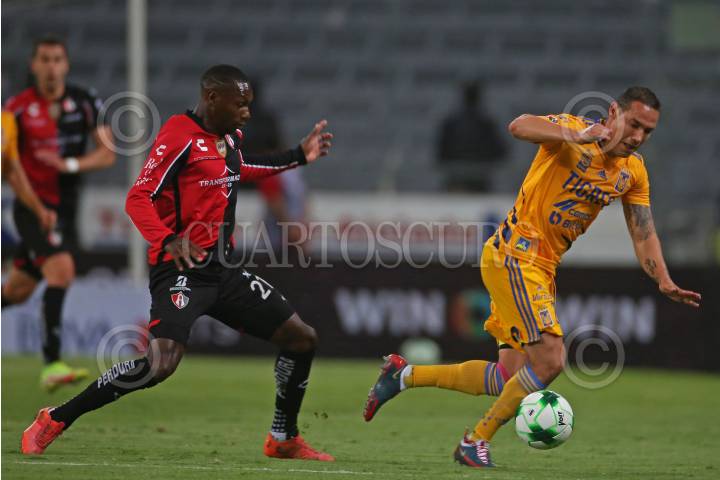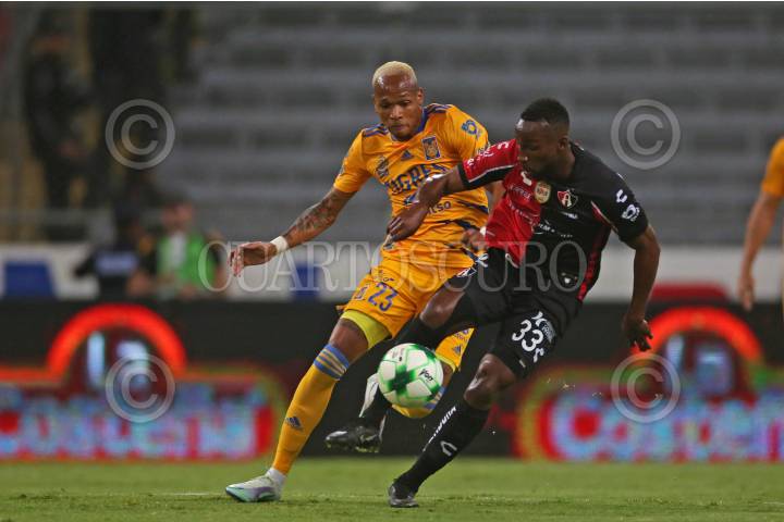 Julián Quiñonez jugador de Atlas disputa un balón con el contrario de Tigres Luis Quiñonez, esto en partido correspondiente a la Semifinal del Torneo Grita México Clausura 2022 de la Liga MX, entre Atlas y Tigres.
