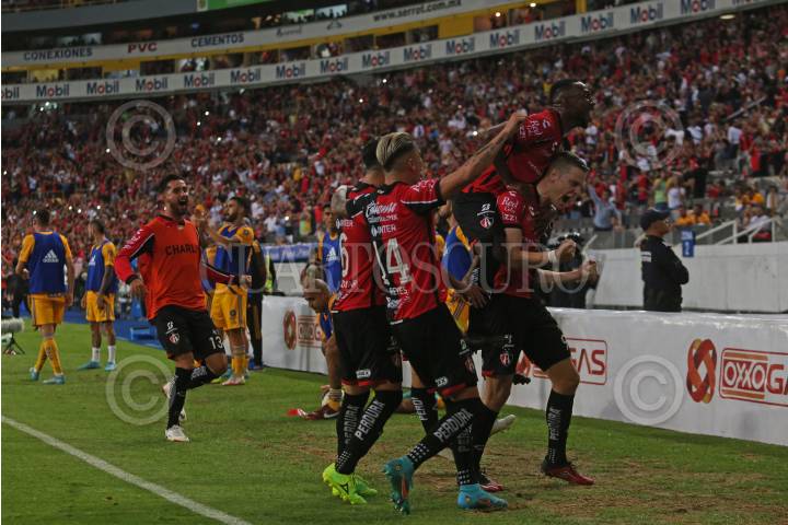 Julio Furch jugador de Atlas celebra su anotación con sus compañeros de equipo, esto en partido correspondiente a la Semifinal del Torneo Grita México Clausura 2022 de la Liga MX, entre Atlas y Tigres.