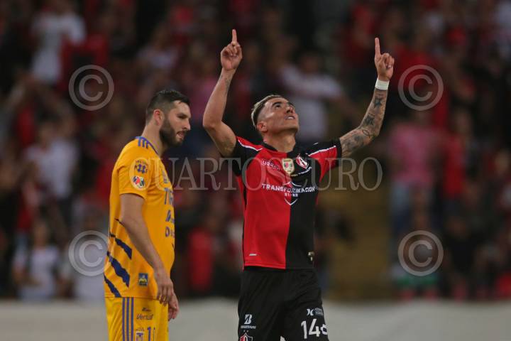 Luis Reyes jugador de Atlas celebra su anotación ante el lamento de André-Pierre Gignac, esto en partido correspondiente a la Semifinal del Torneo Grita México Clausura 2022 de la Liga MX, entre Atlas y Tigres.
