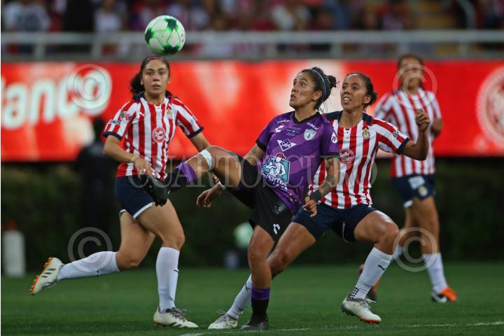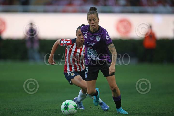 Mónica Alvarado jugadora de Pachuca disputa un balón con la contrario de Chivas, Alicia Cervantes, esto en partido correspondiente a la Semifinal Femenil del Torneo Grita México Clausura 2022 de la Liga MX.