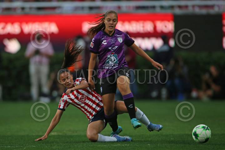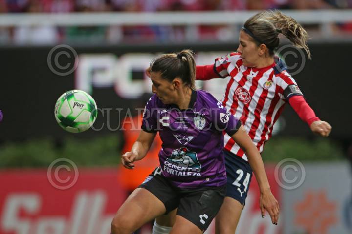 Lizbeth Ángeles jugadora de Pachuca disputa un balón con la contrario de Chivas, Casandra Montero, esto en partido correspondiente a la Semifinal Femenil del Torneo Grita México Clausura 2022 de la Liga MX.