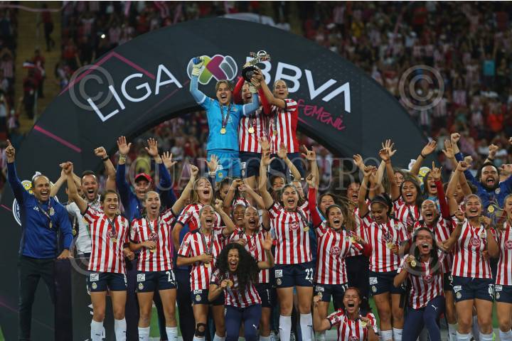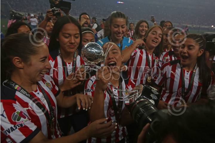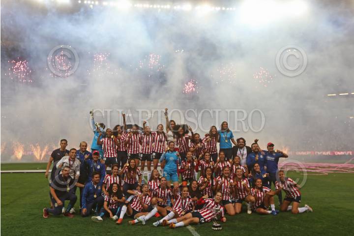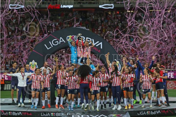 Jugadoras del Club Chivas femenil, durante la entrega del trofeo de la liga mx al coronarse campeonas del Torneo Grita México Clausura 2022.
