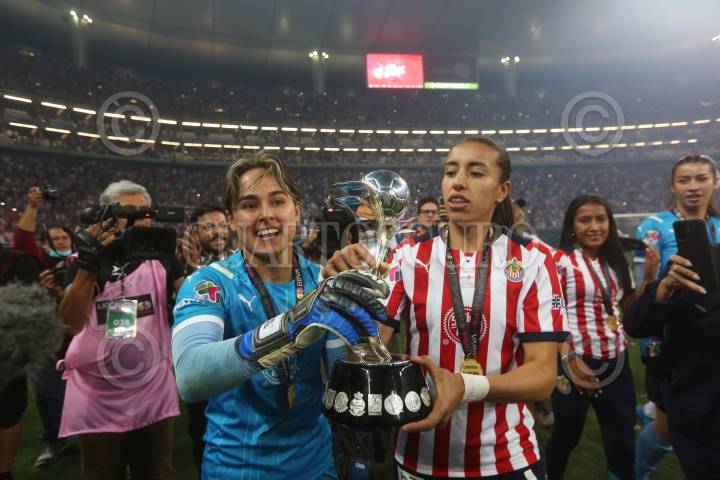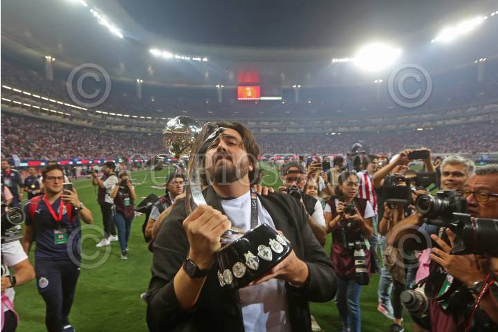 Amaury Vergara Dueño del Club Chivas, celebra con el trofeo la victoria de Chivas Femenil al coronarse campeonas del Torneo Grita México Clausura 2022.