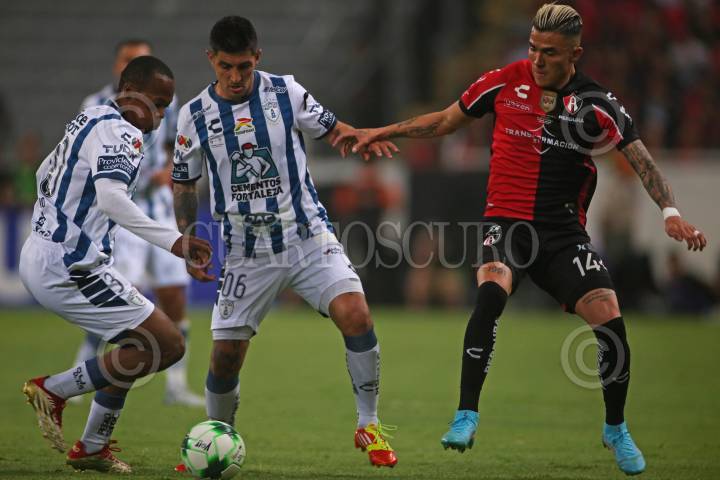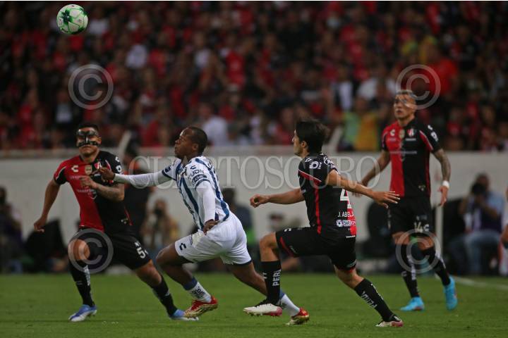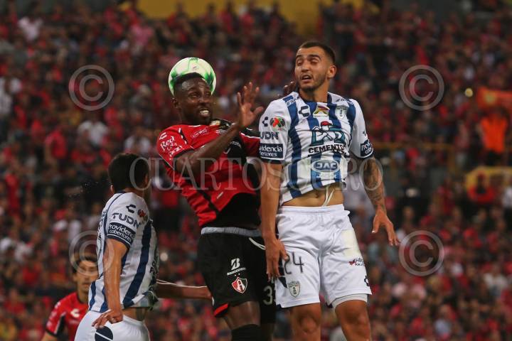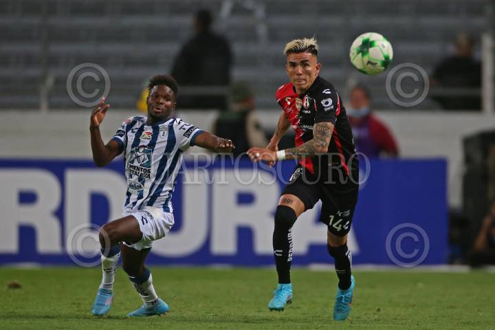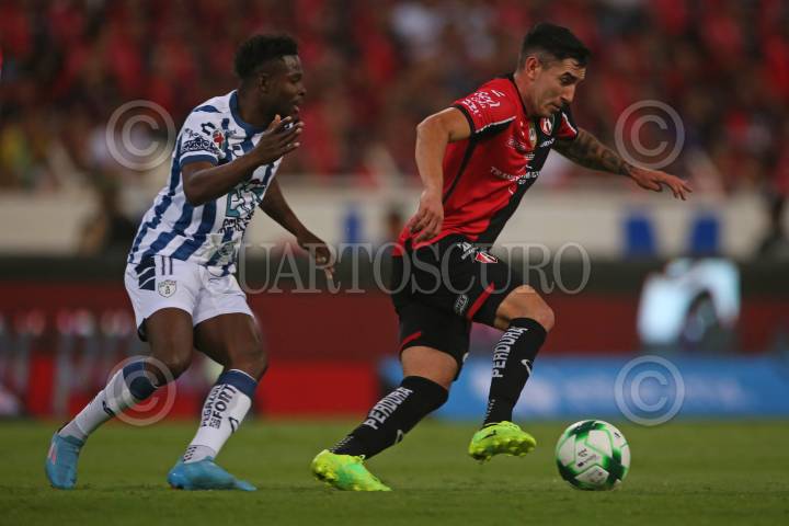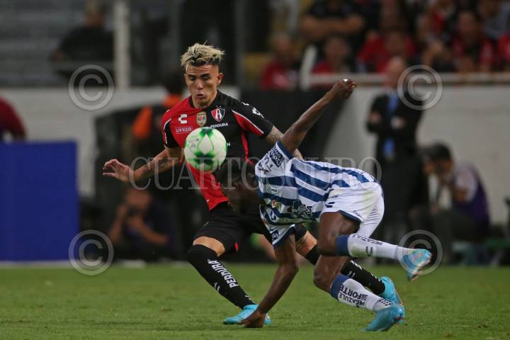 Julián Quiñonez jugador de Atlas disputa un balón con el contrario de Pachuca Luis Chávez, esto en partido correspondiente a la Final del Torneo Grita México Clausura 2022 de la Liga MX, entre Atlas y Pachuca.