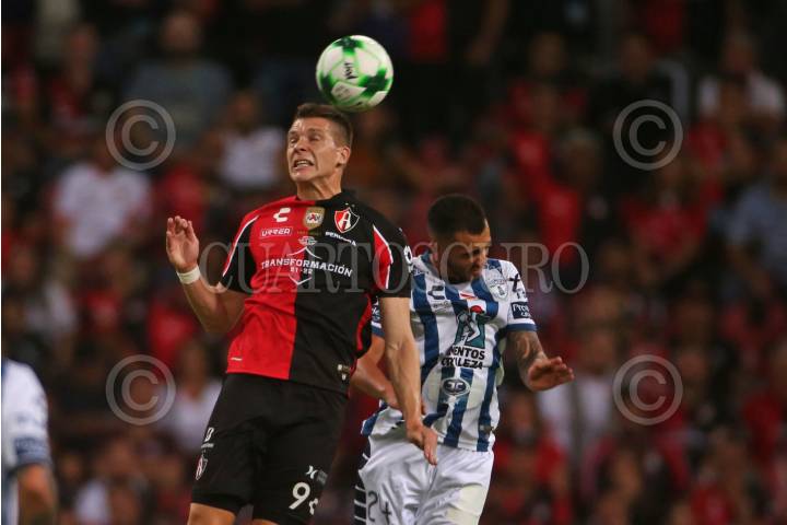 Julio Furch jugador de Atlas disputa un balón con el contrario de Pachuca Luis Chávez, esto en partido correspondiente a la Final del Torneo Grita México Clausura 2022 de la Liga MX, entre Atlas y Pachuca.