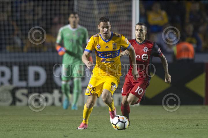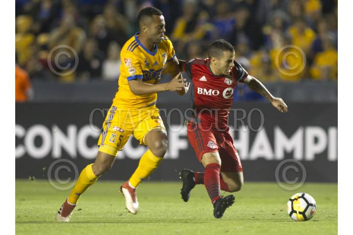 MONTERREY, NUEVO LEÓN, 13MARZO2018.- Jesús Dueñas del equipo de los Tigres de la UANL se disputa el balón con Sevastian Giovinco del equipo de Toronto, durante el partido correspondiente a cuartos de final del torneo de la Liga de Campeones de la Concacaf 2018. Tigres se impuso 3 goles a 2 al equipo canadiense, sin embargo quedó eliminado de la siguiente fase por un marcador global de 4 a 4 siendo los goles del equipo visitante decisivos para la semifinal. FOTO: GABRIELA PÉREZ MONTIEL /CUARTOSCURO.COM