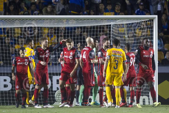 MONTERREY, NUEVO LEÓN, 13MARZO2018.- Jugada previa al penal en favor de Tigres de la UANL contra Toronto durante el partido correspondiente a cuartos de final del torneo de la Liga de Campeones de la Concacaf 2018. Tigres se impuso 3 goles a 2 al equipo canadiense, sin embargo quedó eliminado de la siguiente fase por un marcador global de 4 a 4 siendo los goles del equipo visitante decisivos para la semifinal. FOTO: GABRIELA PÉREZ MONTIEL /CUARTOSCURO.COM