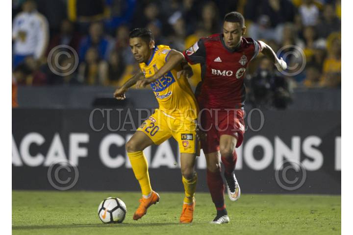 MONTERREY, NUEVO LEÓN, 13MARZO2018.- Alberto Acosta del equipo de los Tigres de la UANL se disputa el balón con Erik Zavaleta del equipo de Toronto, durante el partido correspondiente a cuartos de final del torneo de la Liga de Campeones de la Concacaf 2018. Tigres se impuso 3 goles a 2 al equipo canadiense, sin embargo quedó eliminado de la siguiente fase por un marcador global de 4 a 4 siendo los goles del equipo visitante decisivos para la semifinal. FOTO: GABRIELA PÉREZ MONTIEL /CUARTOSCURO.COM