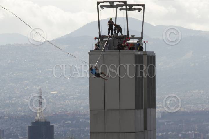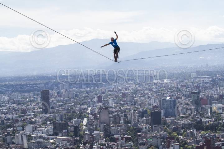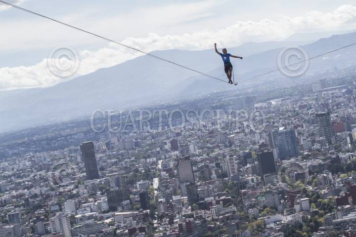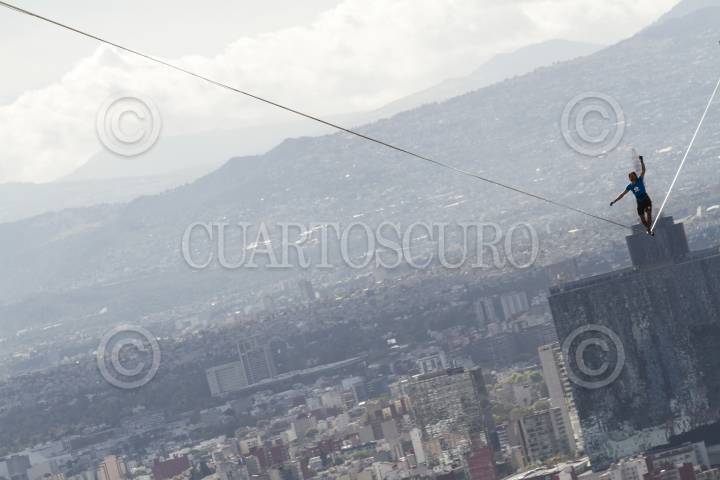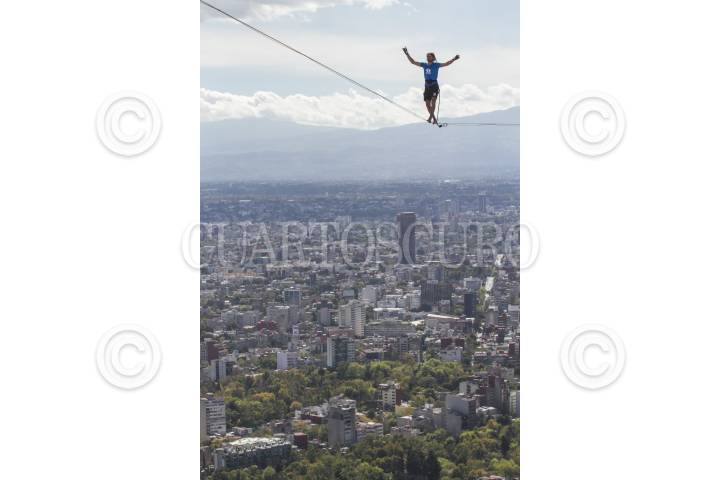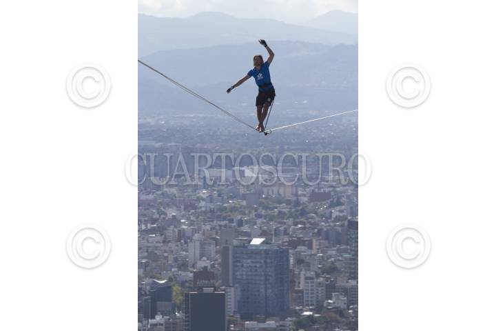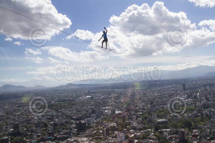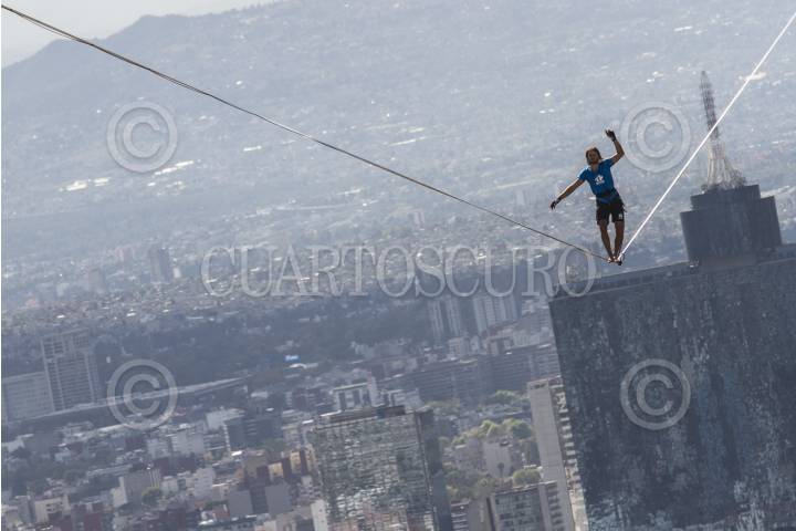 CIUDAD DE MÉXICO, 04DICIEMBRE2016.- El alemán Alexander Schulz impusó un nuevo récord de highline en la Ciudad de México, al caminar sobre la cuerda floja y con solo con dos arneses de protección, una distancia de 217 metros a 247 metros de altura, la línea que sostenía al atleta estaba sujetada de la Torre Bancomer a Torre Reforma. FOTO: MOISÉS PABLO /CUARTOSCURO.COM