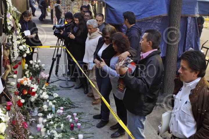 MÉXICO, D.F., 31ENERO2014.- Se cumple un año de la explosión en la Torre B de Petroleos Mexicanos (PEMEX) la cual dejo un saldo de 37 personas fallecidas, familiares de algunas de las víctimas acudieron a cantarles en un improvisado altar colocado en una de las ceras que circundan el edifico de la paraestatal. Autoridades comentaron que el director de esta empresa Emilio Lozoya dedico cinco minutos de su tiempo a un homenaje en punto de las siete, ya que tenía un compromiso. FOTO: MOISÉS PABLO /CUARTOSCURO.COM